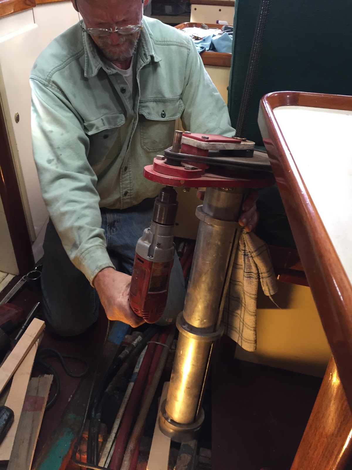 Also, found one keel bolt that needed replace, so here is Kit using his keel bolt extractor...built a new one, with grease fittings & installed it.